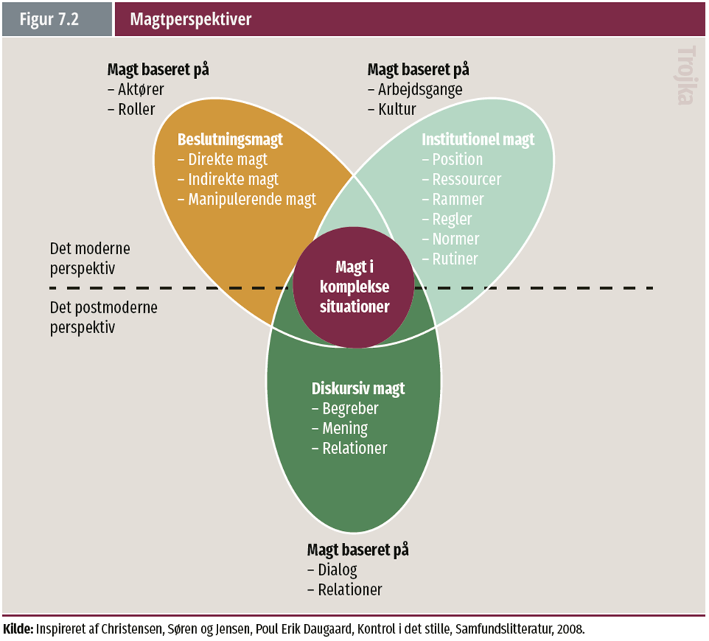 Beslutningsmagt og institutionel magt er begge præget af opfattelserne inden for det moderne perspektiv, hvor der lægges vægt på magt i form af autoritet, regler, normer, rutiner og retfærdighed.