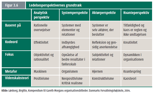 Det analytiske perspektiv er baseret på rationelle overvejelser ud fra modeller og erfaringer. Nøgleordene her er effektivitet og rationelle beslutninger ud fra en tro på objektivitet.