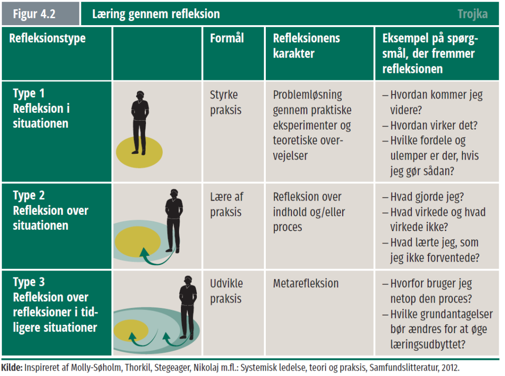 Refleksionstype 3. Her kan du stille dig selv spørgsmål som: Hvorfor bruger vi netop den fremgangsmåde? Hvis vi tænker anderledes, hvordan kan vi så øge læringsudbyttet?
